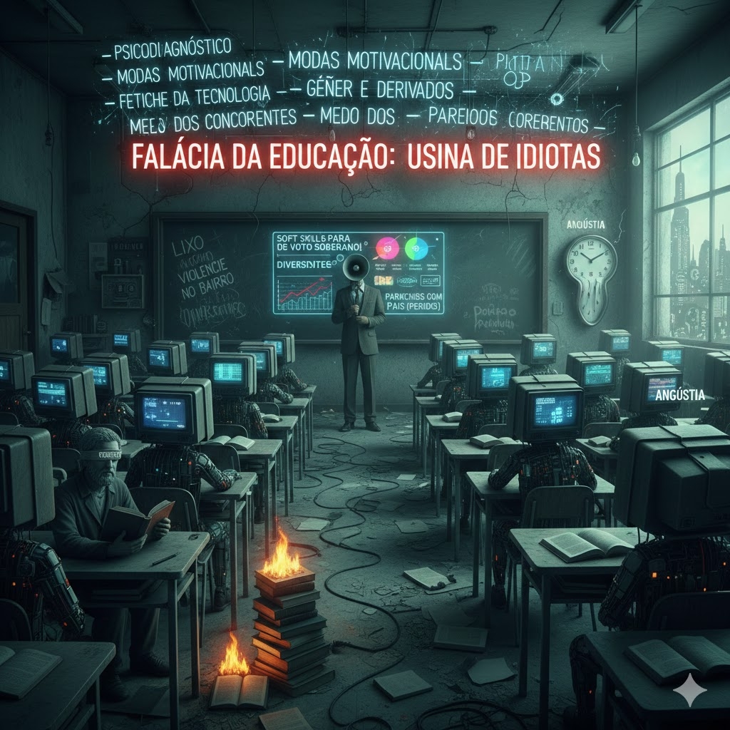 Um dos aspectos mais miseráveis da cultura contemporânea no Brasil — e não só aqui — é o estado da educação. Podemos resumir a educação como uma salada insossa que mistura porções de psicodiagnósticos dos alunos. A saúde mental hoje é assunto para empreendedores, modas motivacionais, intensas doses de marketing, alta influência do fetiche da tecnologia, obsessão por falar de gênero e derivados, e um medo desgraçado dos concorrentes.