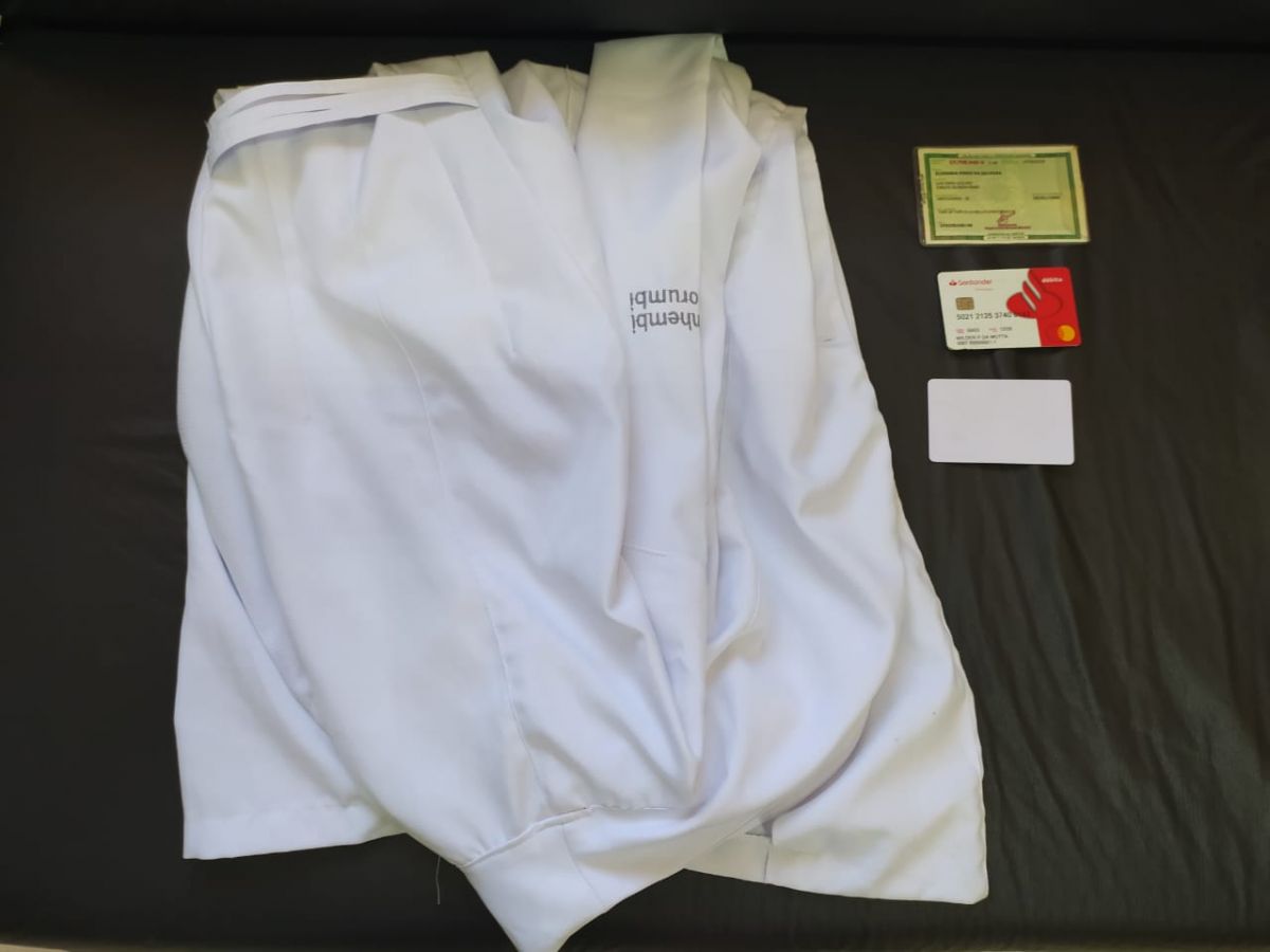 O estelionatário não tinha qualquer documento de identificação próprio quando foi abordado. Contudo, com ele havia R$ 100,00, uma carteira de identidade que afirmou ser de sua esposa, um jaleco, um cartão de crédito e um cartão em branco conhecido como espelho, utilizado para clonagem, além de uma chave acoplada em um chaveiro com propaganda de um hotel da cidade. Os policiais entraram em contato com o hotel e confirmaram que o suspeito tinha se hospedado no local, mas não havia quitado a conta.