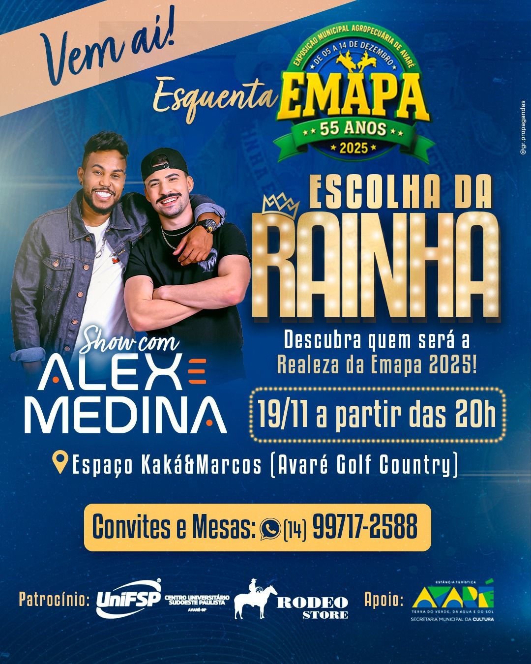 “Descubra quem será a realeza da EMAPA 2025”, destaca a organização. O evento tem início às 20 horas no Espaço Kaká & Marcos. O endereço é Rua Santo André, nº 96, Avaré Golf Country.