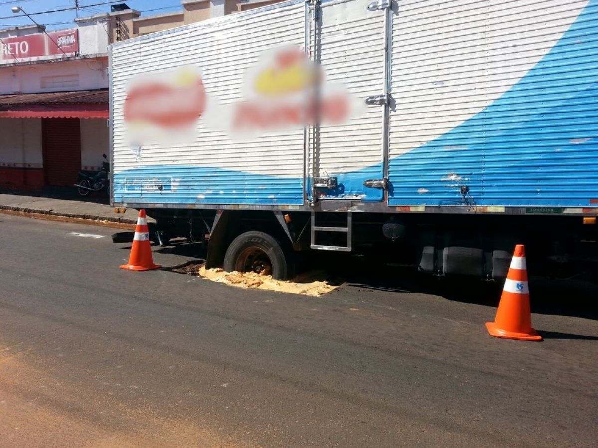 Um caminhão ficou com as rodas traseiras presas em um buraco pela Rua Bahia, na área central de Avaré, nesta quinta-feira dia 13 de julho.
