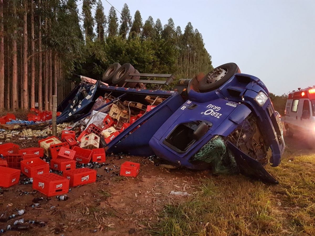Um caminhão carregado com bebidas tombou na manhã desta quinta-feira (10) no quilômetro 1 da estrada vicinal Miguel Marvullo, que liga Cerqueira César (SP) a Manduri (SP). O motorista, de 45 anos, teve fraturas no braço e passa bem.
