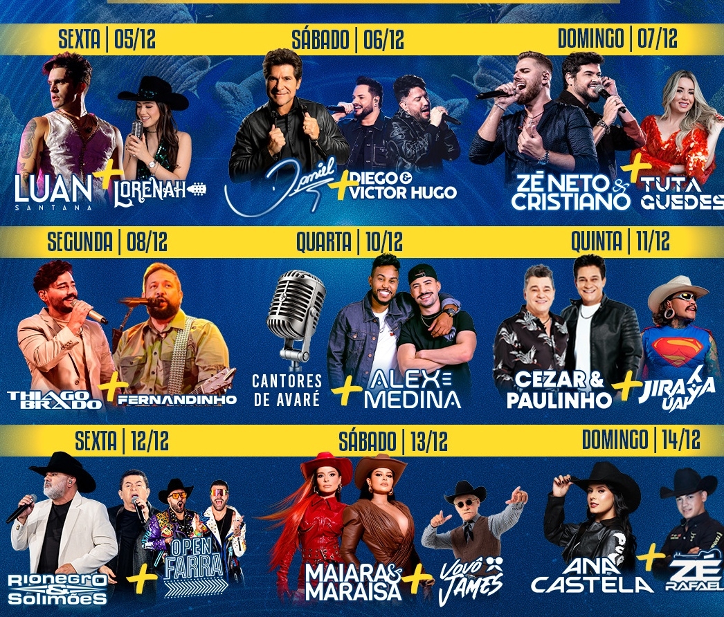 Já a dupla Cezar & Paulinho canta seus sucessos na quinta-feira, 11, seguida de Jiraya Uai. O DJ goiano, outro nome em franca ascensão no mercado, é conhecido por misturar eletrofunk, funk e sertanejo.