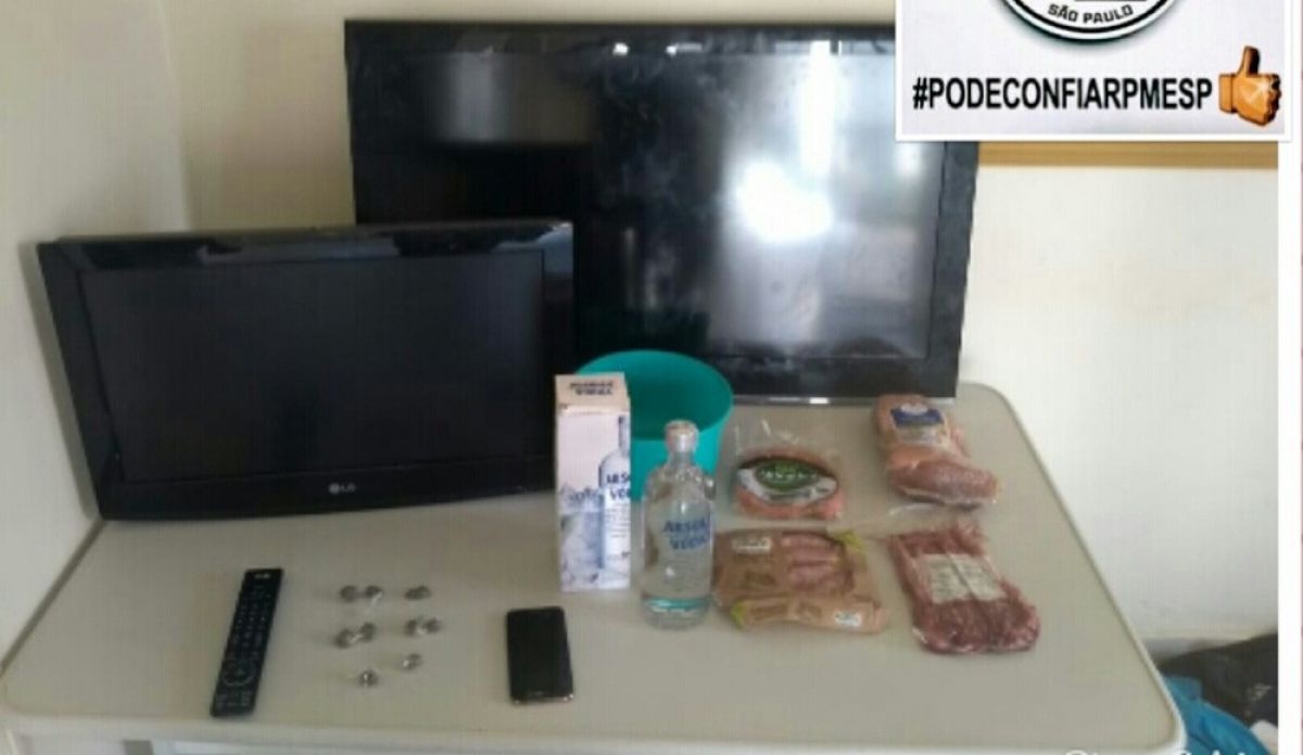 Em nova diligência foi localizado P. E. P. A. de 17 anos, que estava com a outra TV, carnes, embutidos, bebidas e mantimentos, todos produtos oriundos do furto.
