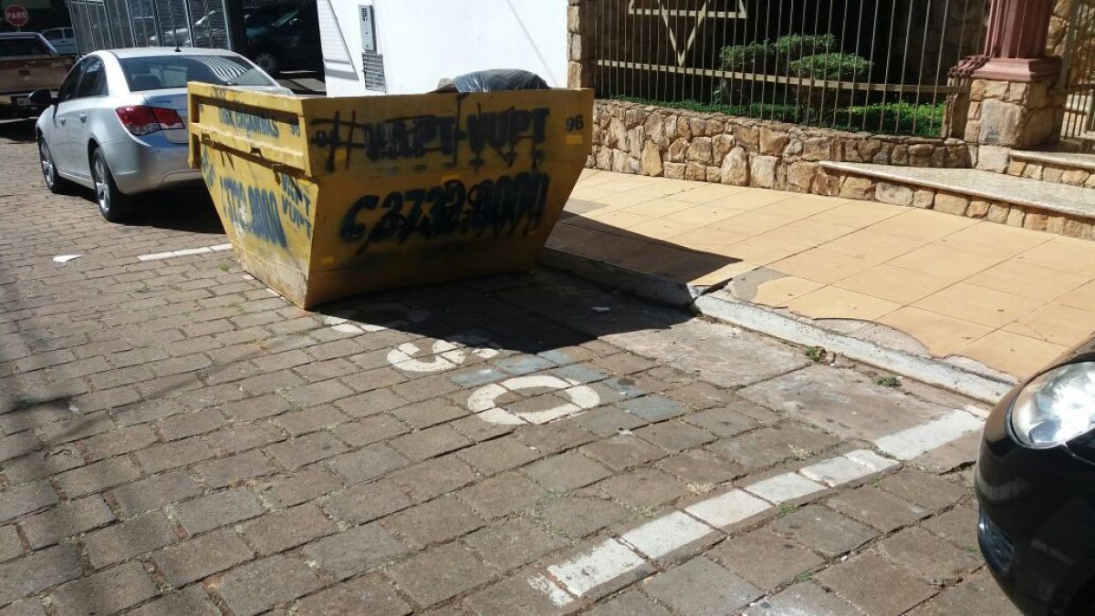 A empresa Vapt-Vupt (conforme mostra a foto) depositou uma caçamba de recolha de entulhos pela Rua Sérgio Bernardino.