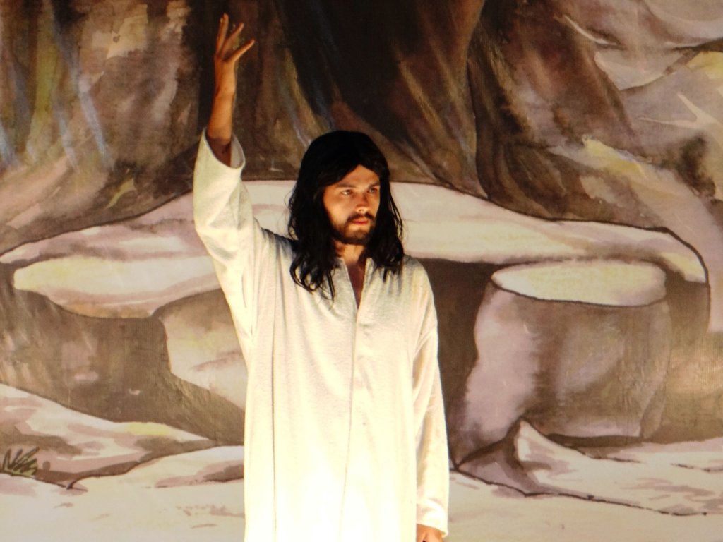 Cena marcante da peça teatral, a ressurreição despertou a emoção do público presente. Sobre uma empilhadeira, o ator Antonio Ramos (Jesus Cristo) foi elevado atrás do cenário e saudou a plateia.