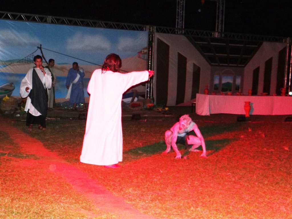 Em oito cenários fixados com treliças, mais de cem atores compuseram a peça teatral, que desde 2006 é encenada ao ar livre. Gilson Câmara, secretário de Cultura e diretor geral do espetáculo, lembra que o diferencial do teatro é a participação de voluntários, que espontaneamente desejaram participar do evento. “Essa vibração das pessoas que participam da peça contagia quem está assistindo, além da história da vida de Cristo emocionar por seu sofrimento”, diz.