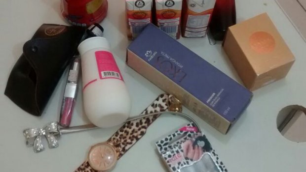 Objetos furtados: 01-delineador,  01-creme natura, 01-batom, 01-perfume boticário, 01-perfume ekos, 01-achocolatado nescal, 01-relógio, 3-leite condensado e 01-isqueiro.