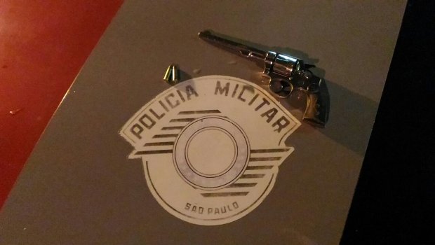 Iniciado vistoria no quarto do suspeito, os PMs localizaram dentro do guarda roupa, embaixo das roupas um revólver municiado com duas munições, sendo uma intacta e outra percutida.