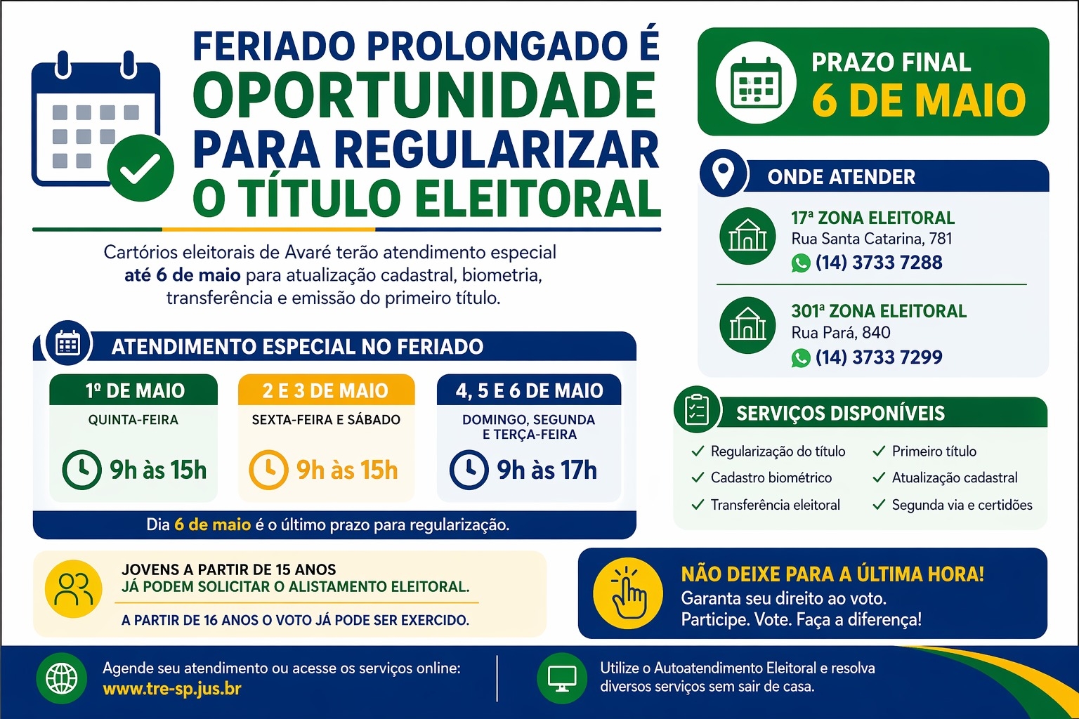 Com a aproximação de mais um processo eleitoral no país, eleitores de Avaré e região precisam redobrar a atenção aos prazos da Justiça Eleitoral. O período para regularização do título eleitoral termina no dia 6 de maio e quem precisa atualizar dados, transferir o domicílio eleitoral, cadastrar a biometria ou emitir o primeiro título deve buscar atendimento o quanto antes para evitar contratempos.