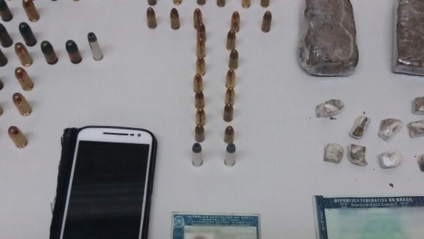 Ao todo, foram apreendidas duas porções grandes de maconha, nove porções pequenas, as 24 munições de 9mm, 18 munições calibre .45 e 4 munições calibre 357. Os policiais vasculharam o celular dele e encontraram conversas com outro homem negociando munições e armas.