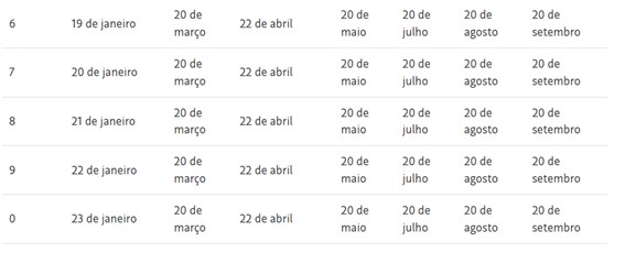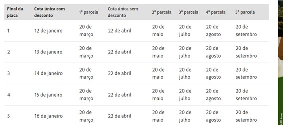 Para automóveis, motocicletas, ônibus, microônibus, camionetas e caminhonetes, o vencimento da primeira parcela ou da cota única do IPVA ocorre em janeiro, de acordo com o final da placa do veículo.