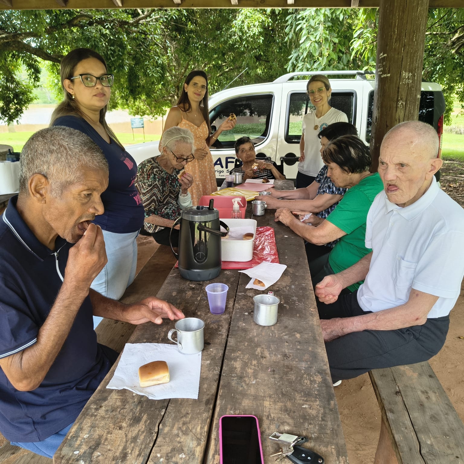 A ação contou com a presença da coordenadora Rita Roesener, da auxiliar administrativa Tainã, da assistente social Aline e da enfermeira Ana Carolina, que acompanharam os idosos durante todo o percurso, garantindo cuidado, atenção e segurança.