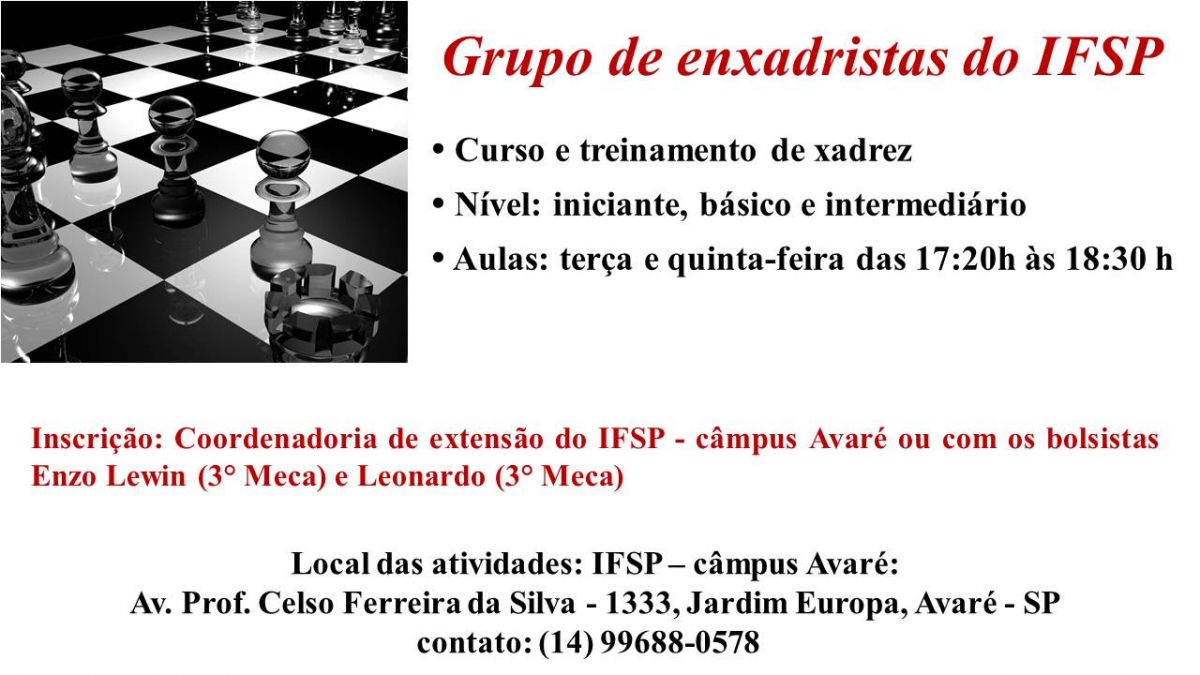 Numa iniciativa da Coordenadoria de Extensão do IFSP, com o apoio do Xadrez Avareense, alunos bolsistas do campus de Avaré estão ministrando aulas para quaisquer interessados em aprender ou aperfeiçoar sua habilidades no esporte dos reis.