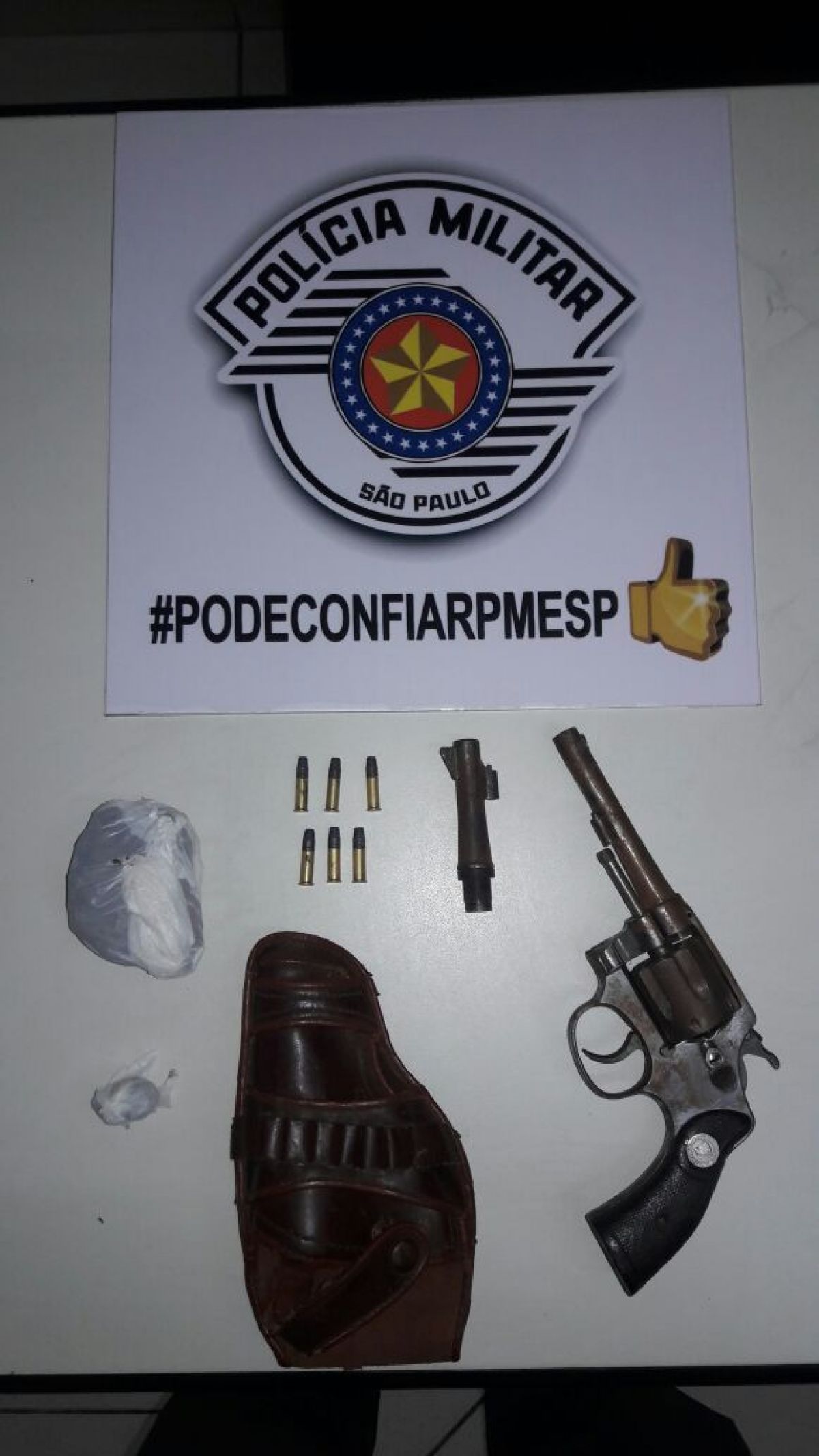 Ainda segundo relato da PM, o suspeito foi acompanhado pelas equipes e sendo abordado na Rua Conceição Lima Pereira, no qual foi localizado em sua posse. no interior da sacola um revólver calibre 32, desmuniciado, uma porção pequena de maconha e uma porção maior pesando 0,035 Gramas.