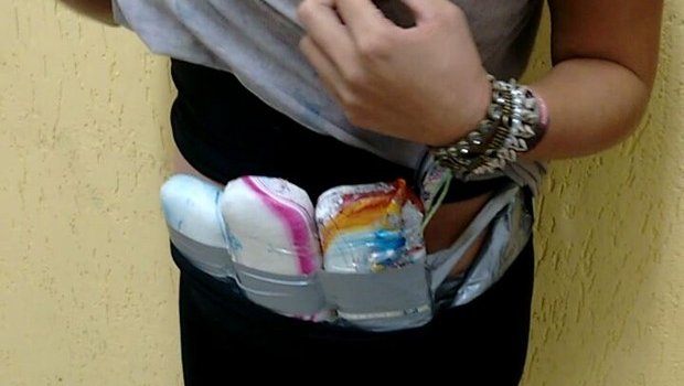 Durante vistoria pelo veículo, os policiais constataram que a passageira estava com três tabletes de haxixe presos por uma fita em sua cintura e outros dois escondidos no sutiã.