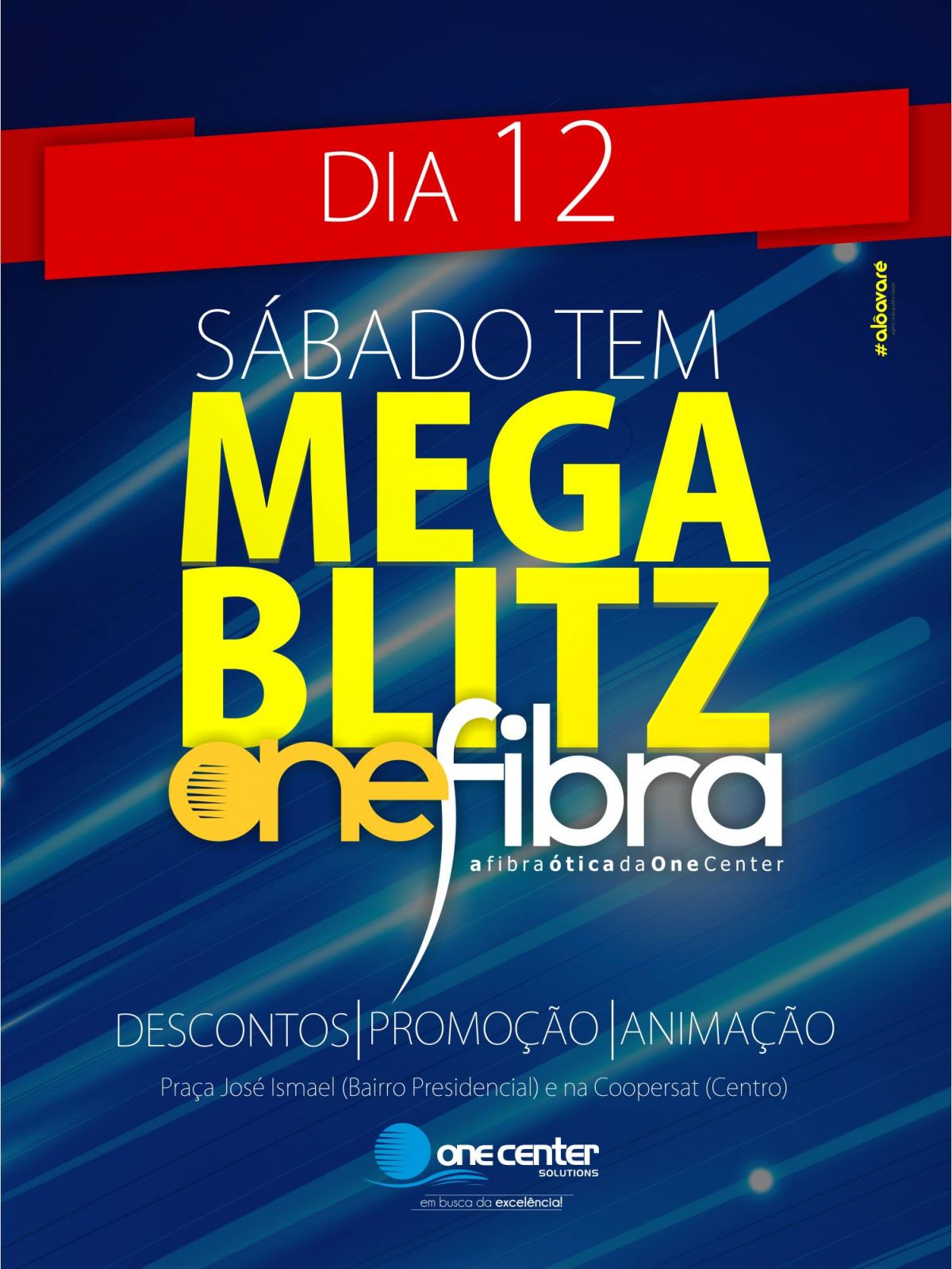 A empresa de internet banda larga de Avaré, One Center estará realizando no próximo sábado, dia 12, a MEGA BLITZ ONE FIBRA, onde serão ofertados descontos imperdíveis para assinaturas de planos em Fibra Ótica. O mega evento será realizado a partir das 10 horas na CooperSat (Rua Alagoas, 1575) no centro de Avaré e na praça José Ismael no meio do bairro Presidencial..