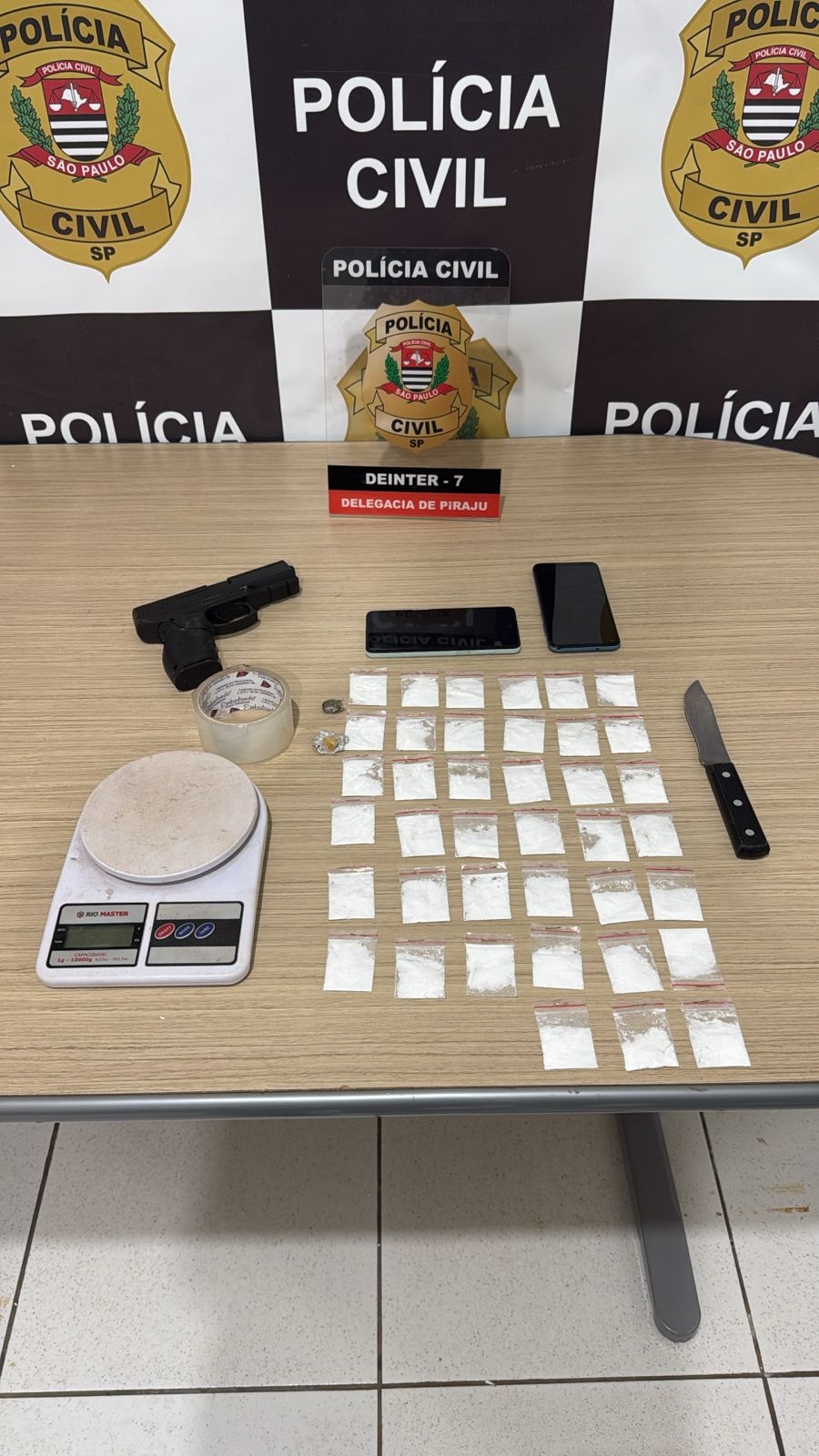 Paralelamente, outra equipe deu cumprimento a mandado de busca na Avenida Emílio Tozoni, onde um jovem de 19 anos foi preso em flagrante. No imóvel, os policiais apreenderam 39 papelotes de cocaína (40,9 g), uma pedra de crack (1,6 g), uma pequena porção de maconha, além de uma balança de precisão, dois celulares, uma faca com vestígios de droga, um simulacro de arma de fogo, fita adesiva e um notebook. A disposição dos materiais na residência indicava organização e rotina de preparo e distribuição de entorpecentes.