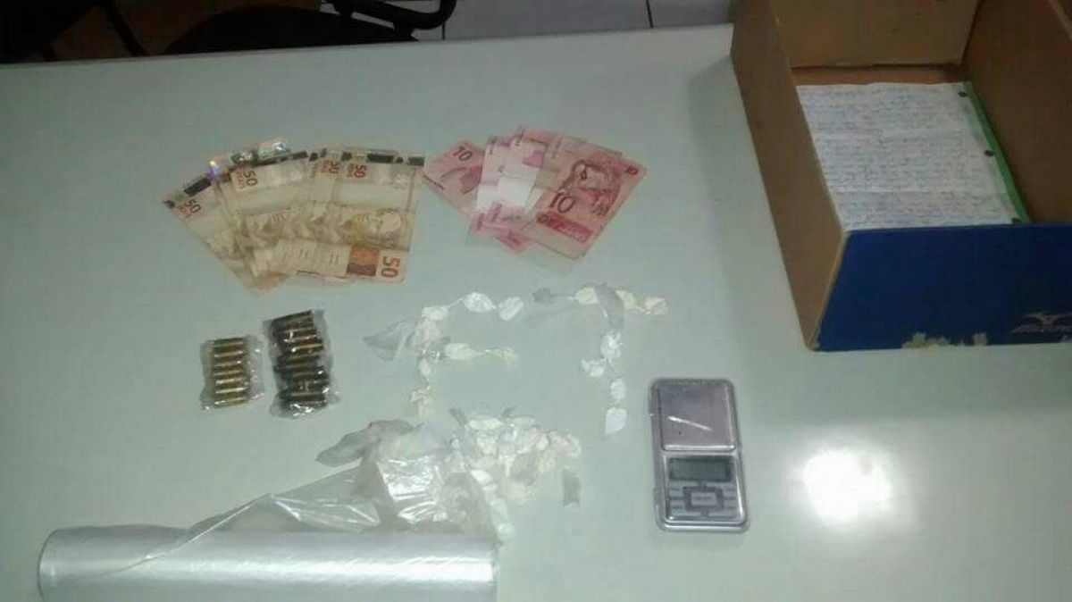 Durante a revista pessoal foi encontrado em suas vestes intimas a quantia de R$ 450,00 em espécie em notas diversas. Ato continuo foi localizado ao solo do quarto 38 porções invólucras em plástico transparente análoga a cocaína e uma porção petrificada não fracionada. Já no quarto do averiguado foi encontrado sobre a penteadeira dos guarda-roupas 17 munições de calibre. 32 de diversos tamanhos e 01 balança de precisão digital e rolo de embalagens semelhantes aos das drogas.