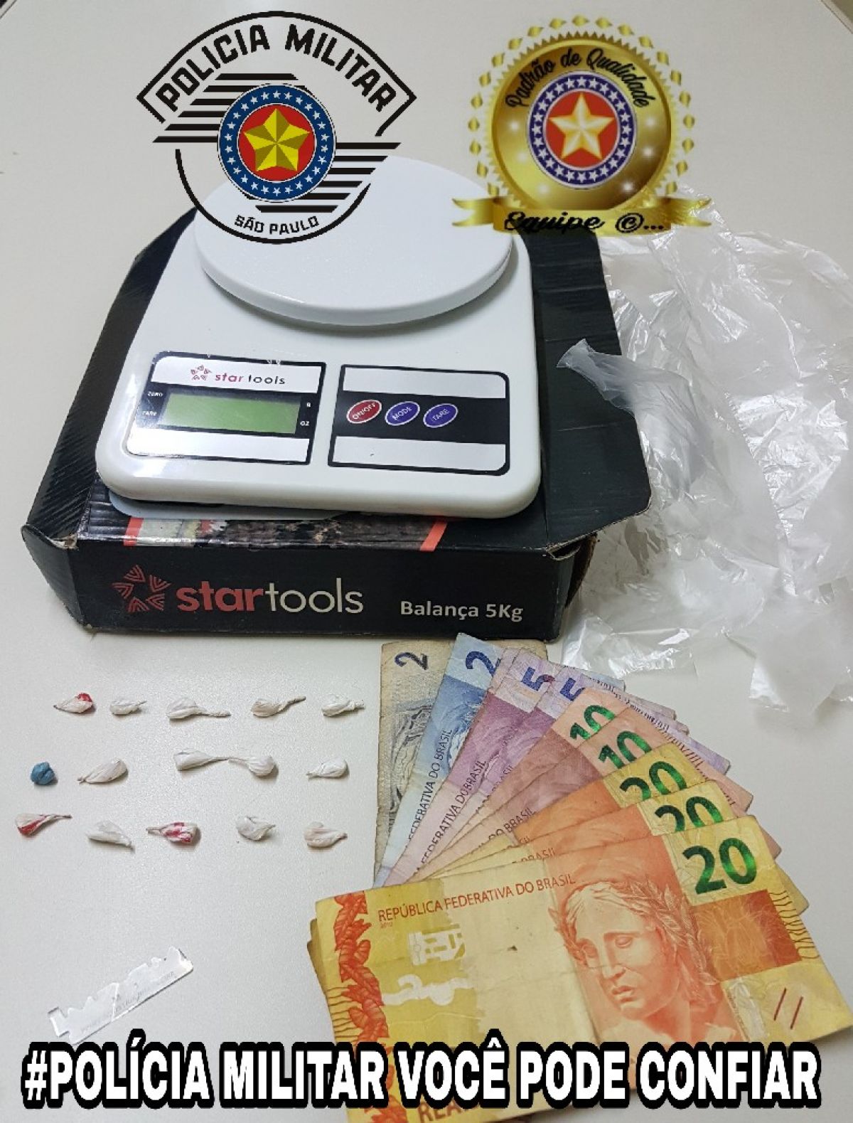 Como o local já era conhecido como ponto de venda de drogas, policiais realizaram uma incursão no local. Os PMs localizaram ao lado de uma cama, onde estavam deitados, mais precisamente em uma cômoda, um copo contendo certa quantia de crack pronto para venda e R$99,00; seguindo nas buscas, no mesmo cômodo foi localizada uma balança de precisão e apetrechos para embalagem da droga, como sacolés, faca e papel alumínio.