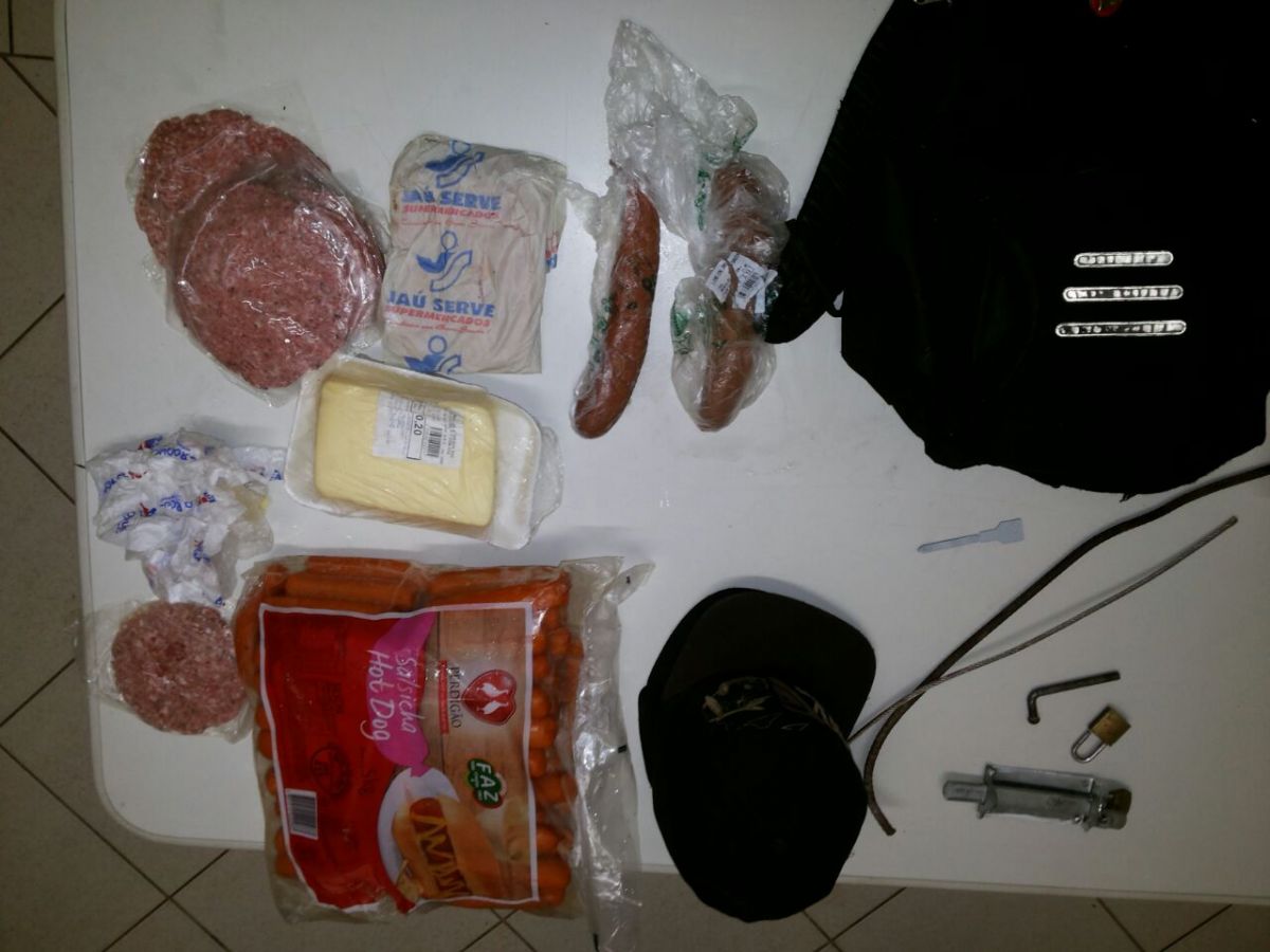 Foi realizada busca nas imediações próximo ao trailer e localizado uma mochila com vários alimentos, comumente usados para fazer lanche, uma barra de ferro e uma mixa, objetos que foram utilizados para danificar o trailer.