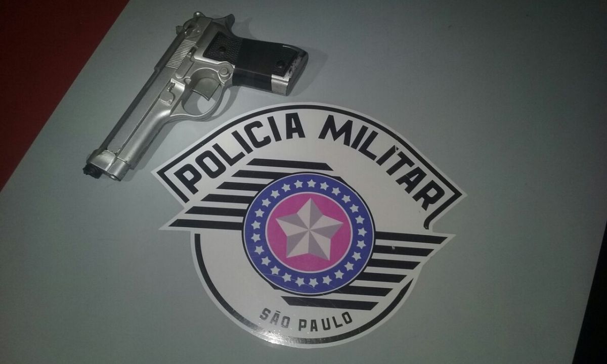 Um dos indivíduos estava portando uma faca e o outro um simulacro de arma de fogo (arma falsa). Os dois foram identificados como sendo V. R e L. da S. B.