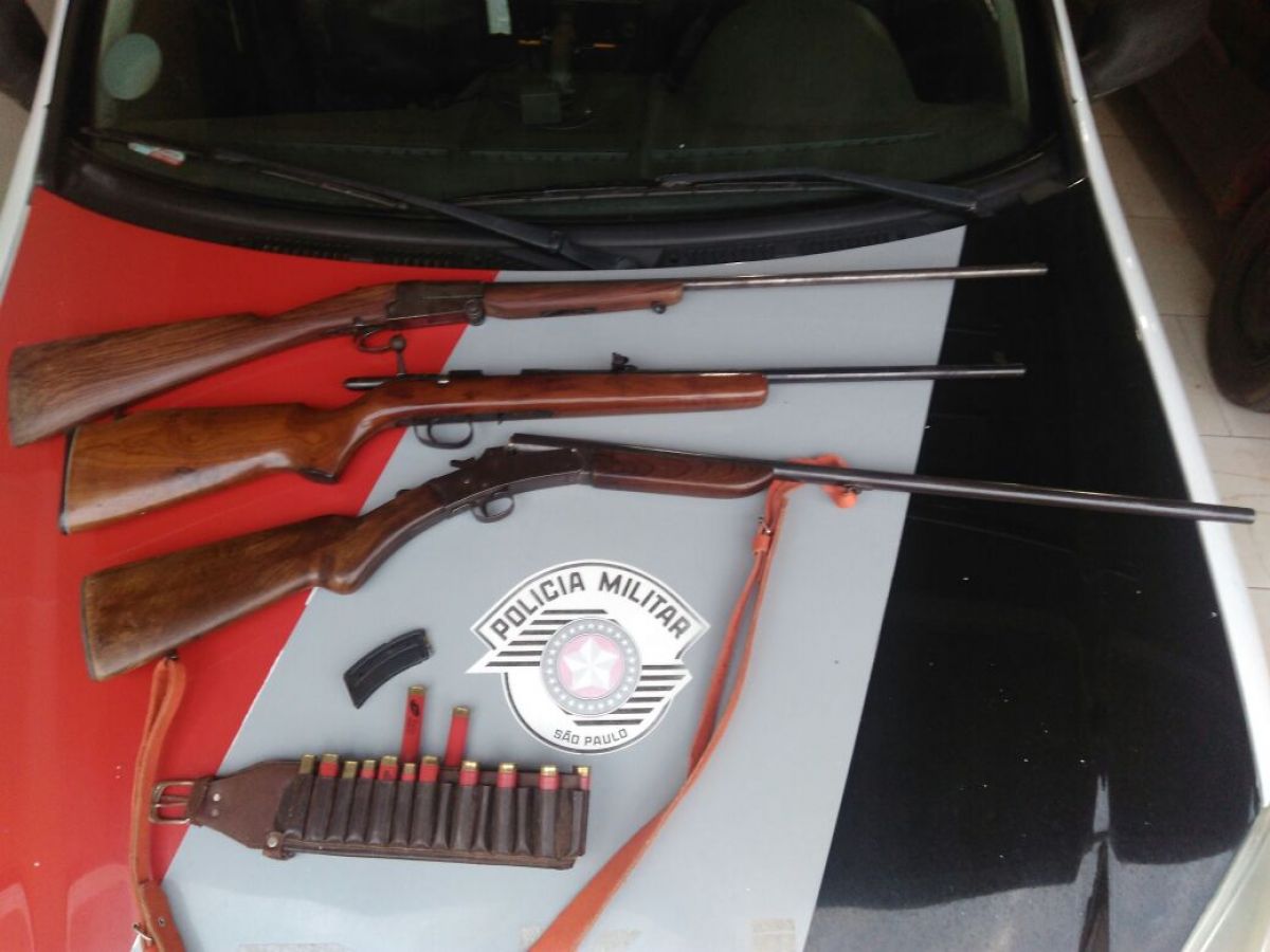 Segundo a PM, os policiais em posse de mandado de busca a domicílio, adentraram a uma propriedade rural onde foi encontrado na casa Sede 2 espingardas , sendo 1 cal. 36 e 1 cal. 28, bem como, 1 carabina cal. 22.