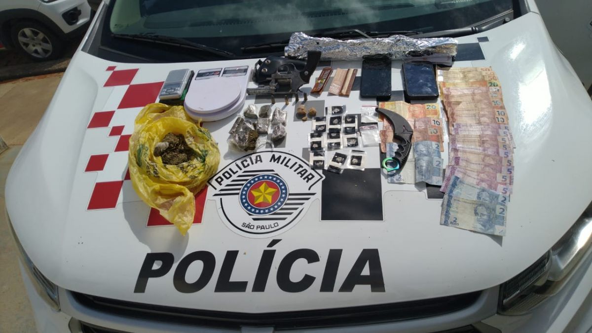 De acordo com a PM, ambos foram abordados e na mochila foram localizadas 9 porções de maconha, 12 porções de cocaína, 2 pedras brutas de crack, 2 balanças digitais de precisão, além de um revólver calibre 32 com 4 munições intactas, uma faca e R$ 279,00 reais.