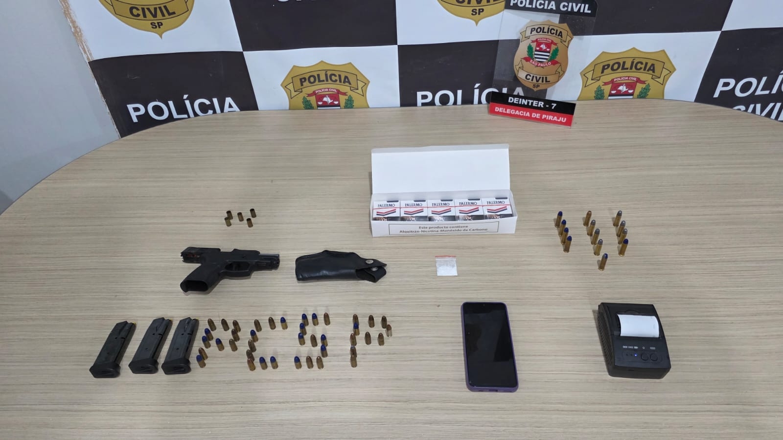 Durante as diligências no estabelecimento comercial e no imóvel vinculado ao investigado, os agentes localizaram uma pistola da marca Taurus, além de três carregadores e expressiva quantidade de munições de diferentes calibres. Foram apreendidas 40 munições intactas calibre 9mm, cinco estojos deflagrados do mesmo calibre, seis munições calibre .357 Magnum e sete munições calibre .38 SPL.