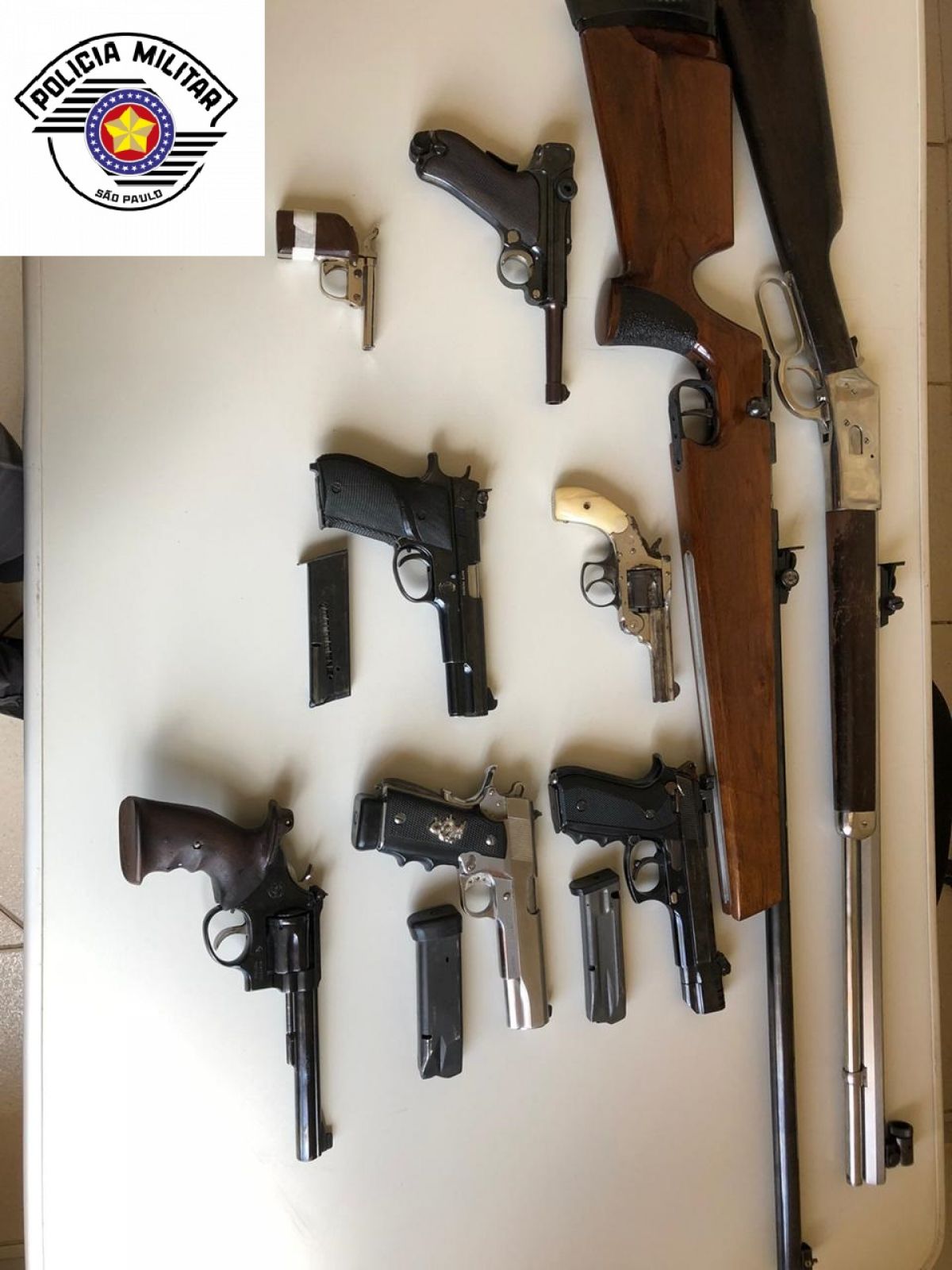 A Polícia Militar realizou busca domiciliar encontrando 9 armas de fogo de diversos calibres, sendo que 6 delas possuíam documentação específica e outras 3 não.