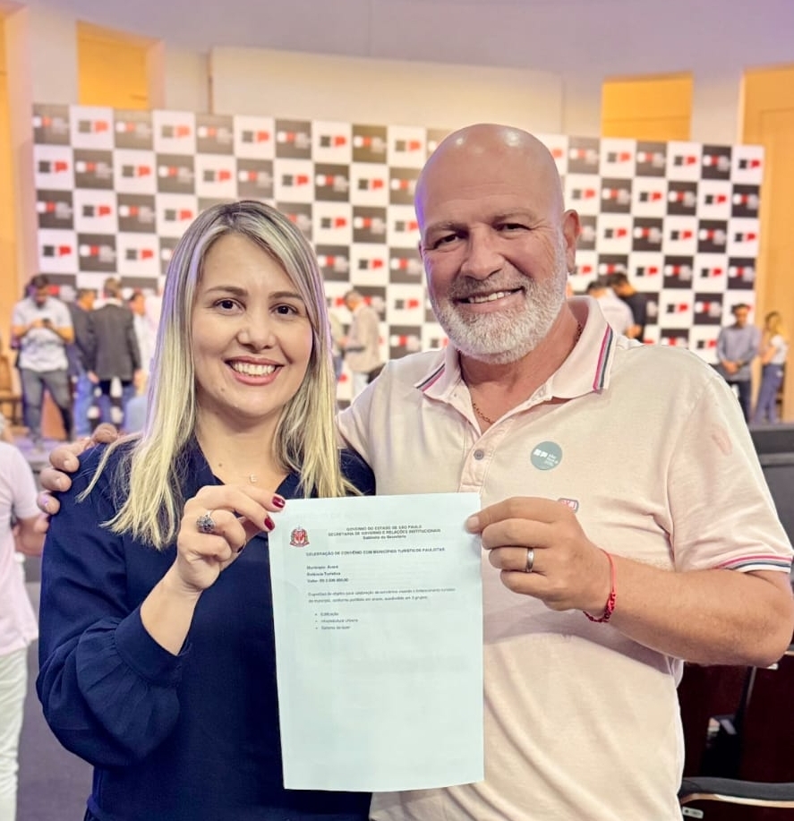 Ao lado da primeira-dama de Avaré, Erika Araujo, o secretário Municipal de Turismo, Claudinei Borges, participou da cerimônia estadual de autorização de convênios para o fomento do turismo paulista.