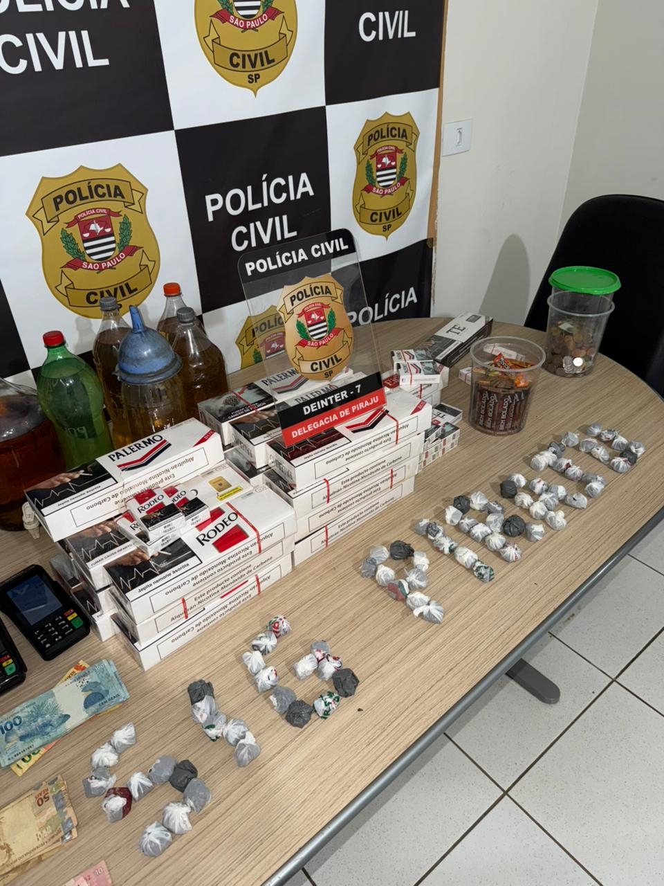 Durante a ação, foram apreendidas 76 porções de maconha embaladas e prontas para a venda, duas máquinas de cartão, aparelhos celulares, R$ 2.346,53 em espécie, além de cigarros de origem paraguaia e bebidas alcoólicas armazenadas em garrafas PET sem rótulo, o que configurou infração sanitária. Parte da droga estava nos bolsos do suspeito, e o restante foi localizado próximo à pia do balcão.