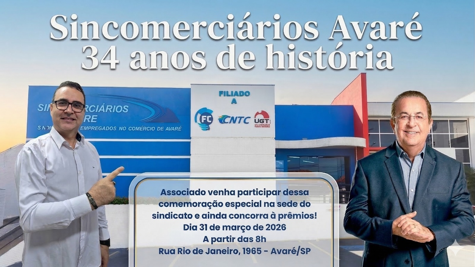 O Sincomerciários de Avaré comemora, no dia 31 de março de 2026, 34 anos de história, conquistas e defesa dos direitos dos trabalhadores do comércio de Avaré e região. Ao longo de quase três décadas e meia, o sindicato tem atuado de forma firme na representatividade da categoria, lutando por melhores condições de trabalho, benefícios e valorização dos comerciários.